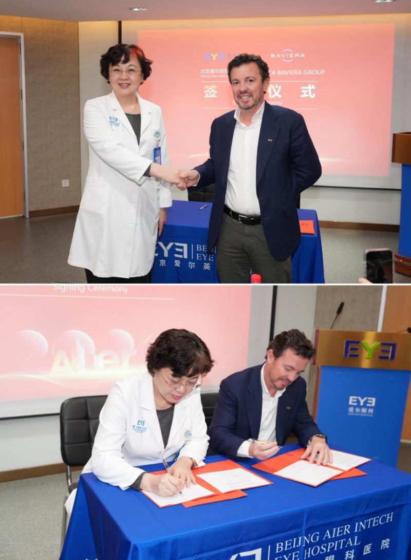 会上,北京爱尔英智眼科医院院长谷威与西班牙Seville诊所医疗总监RafaelLuchena教授共同签署《建立紧密中外医疗联合体合作协议》。根据协议,双方将在学术研究、技术交流、专家互动及管理经验等方面展开常态化合作,并积极探索在北京落地国际化、多边合作的眼科示范项目,借助巴伐利亚集团的欧洲网络与爱尔的本土资源,推动中欧眼科医疗标准的深度融合。