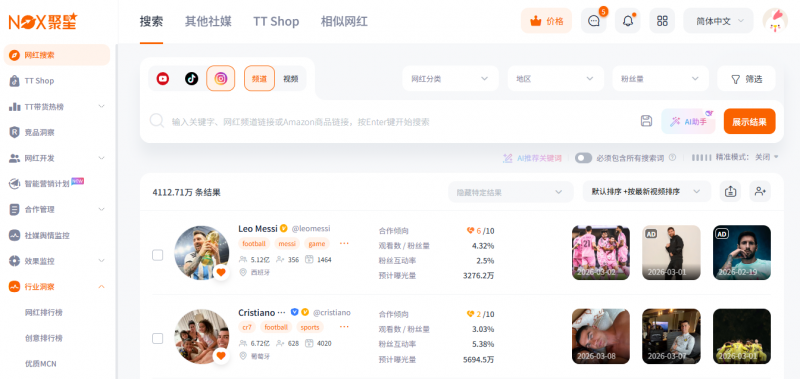 1.5亿全球网红资源的背后,是Nox聚星对全球市场的深度布局与资源整合能力的极致体现,更是其海外网红营销平台核心优势的直接彰显。据悉,Nox聚星的网红资源覆盖全球200+国家和地区,YouTube、TikTok、Instagram三大主流社媒平台,涵盖头部、中腰部、尾部全层级网红,更是覆盖服饰、美妆、3C、宠物、户外、母婴等全行业上千个类目,无论是流量爆棚的头部红人,还是精准触达细分人群的垂类达人,品牌都能通过这款专业的海外网红营销工具快速找到适配自身调性的合作资源,彻底打破海外网红资源获取难、匹配难的行业痛点。