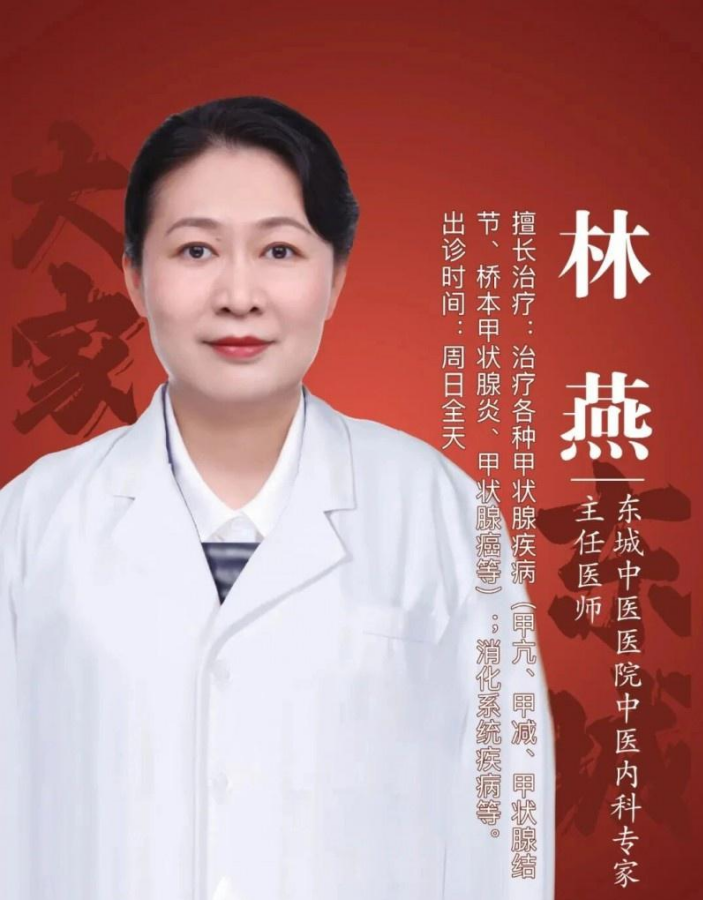 林燕,东城中医医院特聘专家,主任医师,教授,博士生导师,出诊时间周日全天。兼任中华中医药学会内科分会委员、中华中医药学会感染分会委员、世界中医药联合会消化专业委员会理事,北京中西医结合学会甲状腺专业委员会副主任委员。擅长中药内外结合治疗各类甲状腺疾病,肝脾胃同调治疗各类脾胃疾病。主持国家自然科学基金课题1项,参加973课题4项,主持并参加各级科研课题30余项。荣获北京市教学成果二等奖1项,北京中医药大学教学成果一等奖1项,中国中西医结合学会科学技术一等奖1项、三等奖1项。发表学术论文80余篇,主编著作20余部。擅长疾病:各种甲状腺疾病(甲亢、甲减、甲状腺结节、桥本甲状腺炎、甲状腺癌等);消化系统疾病(慢性胃炎、胃食管反流、结肠炎、便秘、胆囊炎、胆结石等);心血管疾病(高血压、糖尿病、冠心病、脑梗塞等)。