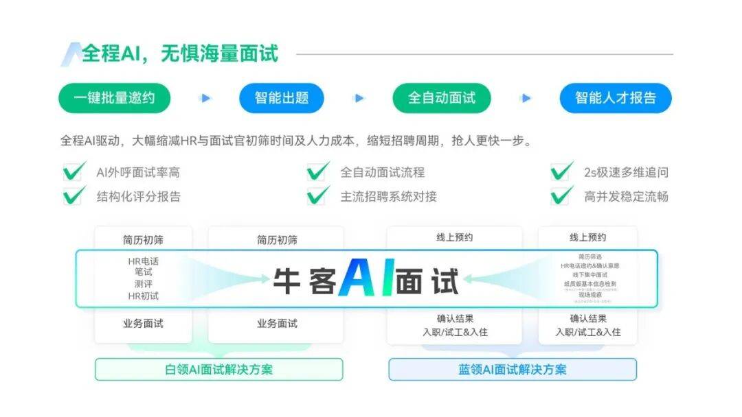 图牛客AI面试解决方案因此,当传统流程在效率和人力投入上压力开始集中显现,寻找更高效、可规模化的解决方案成为必然选择。图拉斯与牛客携手,落地AI面试解决方案,致力于用AI解决招聘中高频、标准化、重复度高的问题。