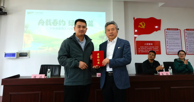 签约仪式后,现场举行了荣誉授予环节。奇鹤村领导为千年舟集团董事长、千年舟绿色公益组织理事长陆铜华颁发奇鹤村 “荣誉村长”证书,这既是对千年舟集团绿色公益行动的高度认可,更是对企业持续助力乡村生态振兴的殷切期许。