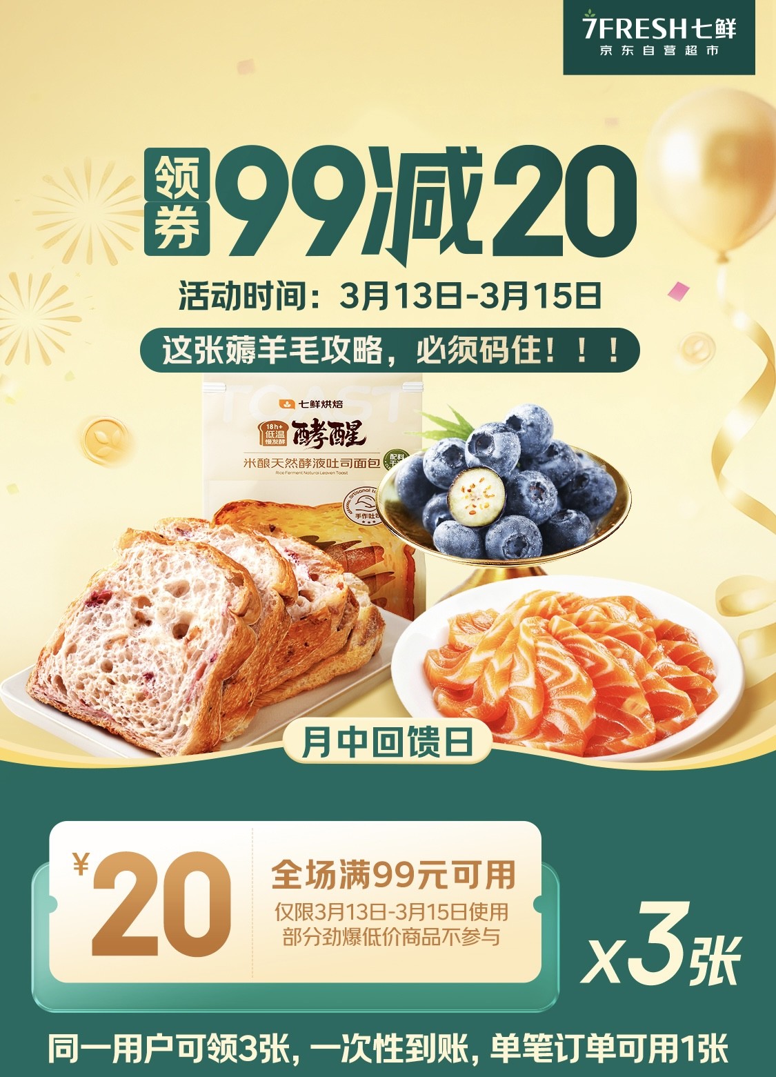 春意渐浓,正是焕新餐桌、补给家需的好时节。3月13日-3月15日(本周五至周日),备受消费者期待的京东七鲜超市“月中回馈日”活动再度来袭。活动延续七鲜一贯“满额直减、不烧脑”的实惠政策,除部分直降爆品外,全场可领券享“满99减20”优惠。无论是追求极致新鲜的每日餐桌,还是为未来一周甚至更长时间的家庭储备,本周末都是一次不容错过的“囤货”良机。