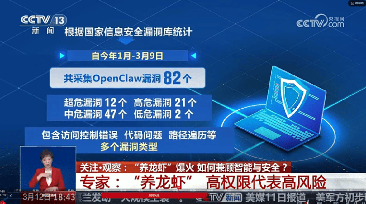 3月12日晚,央视新闻推出专题报道《"养龙虾"爆火如何兼顾智能与安全》,聚焦开源AI智能体OpenClaw(俗称"龙虾")的应用热潮与安全隐患。报道中,安恒信息高级副总裁、研究院院长、中国网络空间安全协会人工智能治理专业委员会专家王欣分享了专业级安全防护解决方案,为规范使用OpenClaw提供了指引。