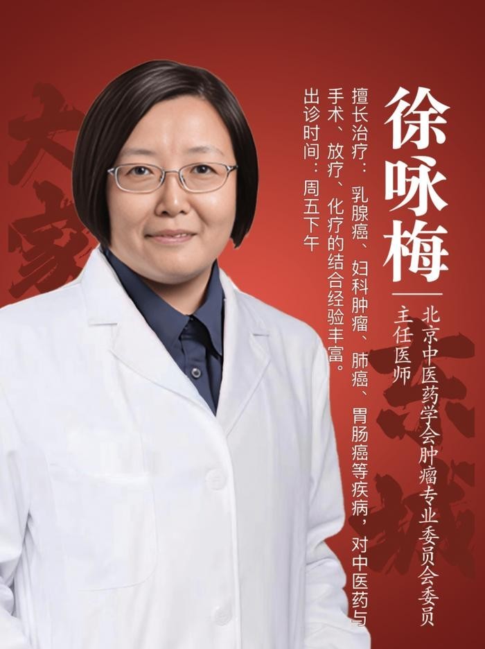 徐咏梅,主任医师,东城中医医院特聘专家,出诊时间:周五下午。第三批全国名老中医经验继承人,师从郁仁存主任。现任北京乳腺病防治协会中西医结合专业委员会副主任委员,北京中医药学会肿瘤专业委员会委员,北京中西医结合学会血液学专业委员会副主任委员。长期从事中医及中西医结合治疗恶性肿瘤的临床工作。对常见肿瘤的中医、中西医结合诊疗有较深入研究。在中医药与手术放疗、化疗的结合治疗上经验丰富,尤其擅长乳腺肿瘤、妇科肿瘤、肺癌、胃肠癌等疾病的中医及中西医结合治疗。