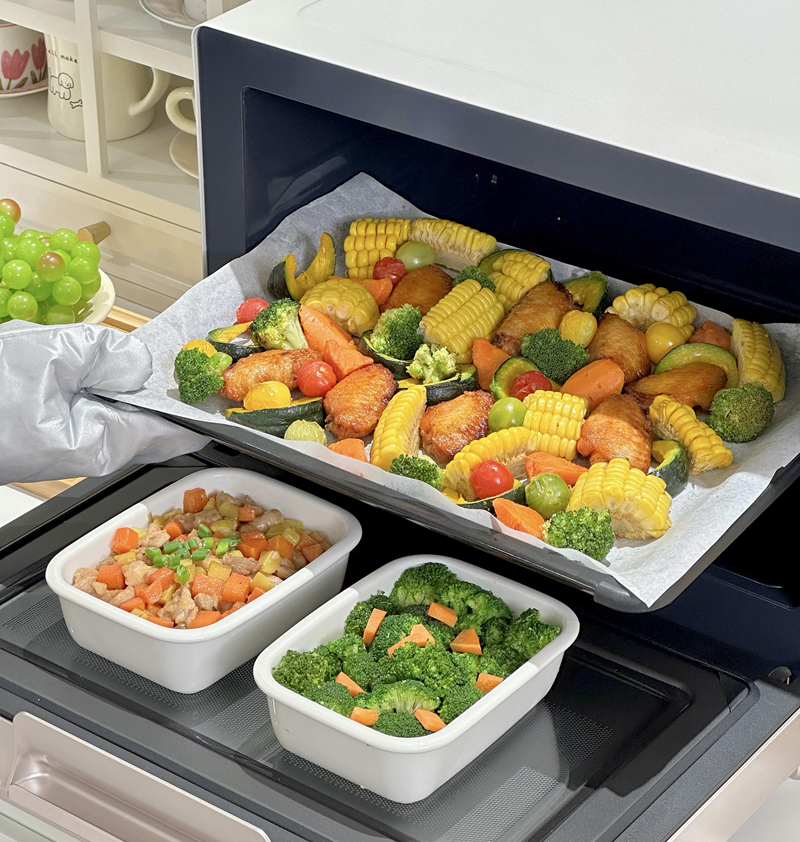 在容量方面,产品升级至32L大容量设计,支持双层同蒸或同烤,大幅提升家庭备餐效率。无论是准备家庭晚餐、蒸鱼烤鸡,还是周末烘焙蛋糕和披萨,都能够轻松完成。
