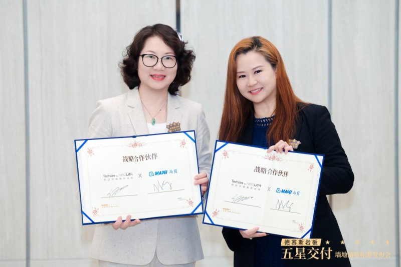 行业的进步离不开生态的协同,发布会上,德赛斯与意大利马贝集团、德国福莱捷两大行业顶尖品牌完成战略合作签约,两大品牌正式成为德赛斯岩板墙地铺贴工艺标准的联合起草单位,以全球顶尖的辅材技术与测量放线技术,为标准化落地提供专业保障。