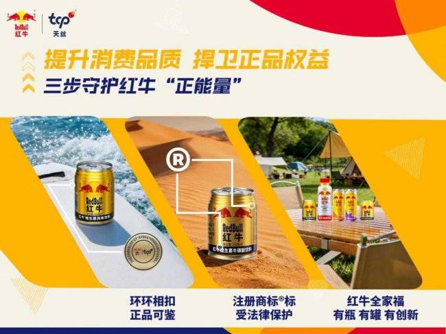 天丝集团持续面向中国市场开发多元创新产品,目前在中国大陆授权销售的正品红牛饮料包括:经典金罐红牛产品红牛®维生素风味饮料和红牛®维生素牛磺酸饮料、“0糖果味”红牛®维生素能量饮料及国内首款瓶装红牛®能量饮料。消费者可通过罐体“天丝集团(TCP)授权标识”及“红牛®”“双牛图形®”商标识别正品,让品质承诺触手可及。