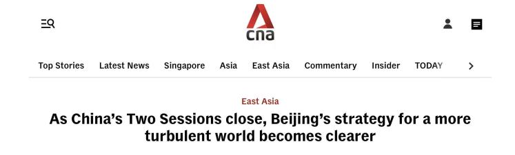 新加坡《亚洲新闻台》网站刊载的一篇报道指出,3月11日和12日相继闭幕的中国全国两会通过阐释外交政策以及强调提振内需和“投资于人”等举措,为中国未来一年乃至更长远的政策重点指明了方向。在全球局势动荡的背景下,中国的政策方向更加清晰。