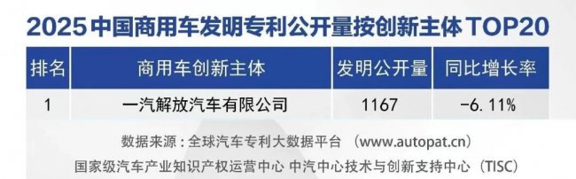 一汽解放始终坚持科技自立自强,不断构筑“科技解放”自主知识产权护城河。2025年全年发明专利公开量达到1167件,领先第二名646件,是我国商用车领域唯一突破千件的企业,并连续三年位居中国商用车行业第一,关键核心技术储备遥遥领先,切实发挥出国资央企“科技创新、产业控制、安全支撑”作用,充分彰显一汽解放作为“国车长子”的深厚技术底蕴和产业责任担当。