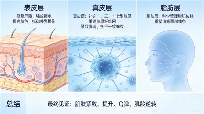 脂肪层:针对针对因胶原支撑力不足导致的脂肪位移、胶原不足带来的松弛、轮廓不清晰,通过高定系列进行科学管理,重塑清晰的面部线条。,通过定制化方案科学护理,重塑清晰面部线条。