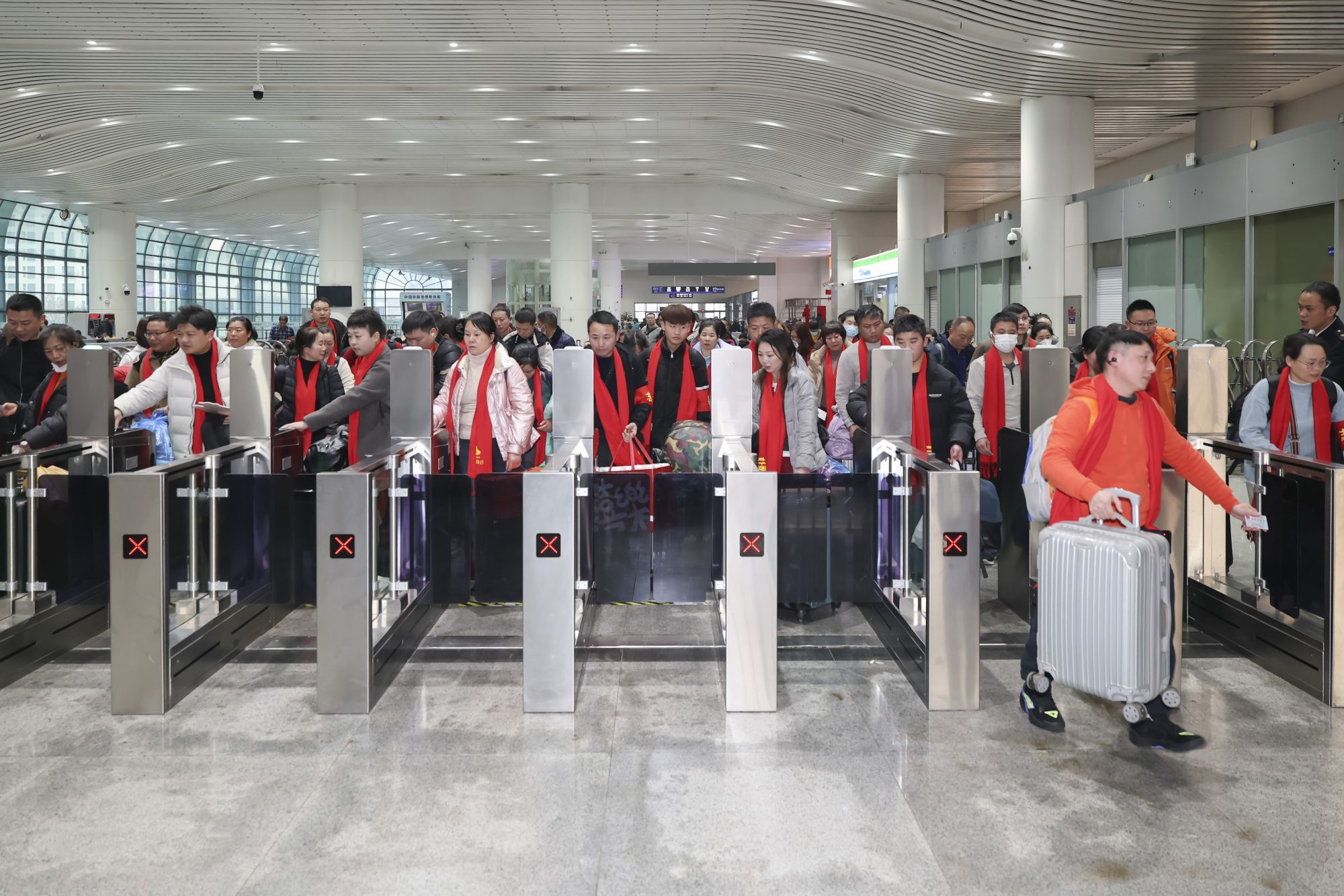 2月11日,枣阳籍务工团体在上海站优先检票进站。新华社记者 王翔 摄