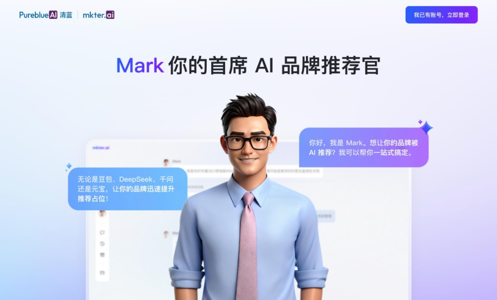 为了将深厚的技术积淀赋能给更多企业,PureblueAI清蓝正式推出了企业AI营销数字员工平台mkter.ai。在该平台上线的“Mark”,定位于行业首位AI口碑营销专家。Mark如同企业专属的“AI品牌推荐官”,它拒绝千篇一律的虚假溢美之词,而是深入学习企业真实的营销物料与行业知识库。