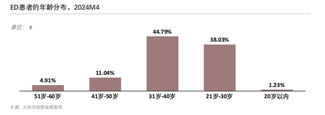 从年龄结构来看,中年群体仍是核心人群,但年轻化趋势已十分显著。数据显示,31-40岁的男性占ED患者总量的44.79%,作为家庭与职场的中坚力量,这个群体背负着上有老下有小的家庭责任,面临着职场晋升的双重压力,“中年危机”最先体现在了生理健康的滑坡上。而更值得关注的是,21-30岁的年轻患者占比已达到38.03%,与中年核心群体的差距持续收窄,熬夜、酗酒、久坐等不良生活习惯,以及性行为活跃度的提升,让ED问题呈现出明显的低龄化走向,也让抗ED用药的消费群体边界持续拓宽。