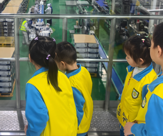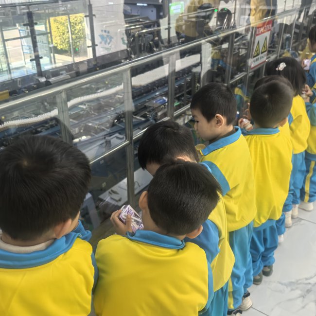 在蒙牛清远低温工厂,一群来自幼儿园的小朋友正透过明亮的走廊,参观现代化的生产线、严谨的工艺环节、洁净的生产环境。厂长也用童趣化的语言,向孩子们介绍“牛奶如何变身美味酸奶”“蒙牛怎样守护每一滴奶的品质”,让抽象的“品质”变得可感可知。
