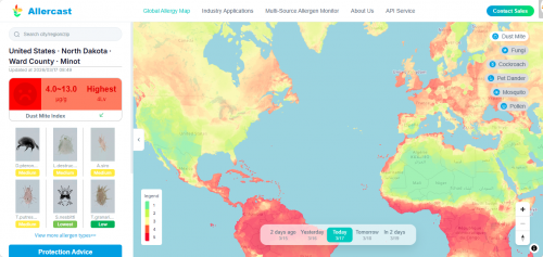 敏舒科技专注于过敏健康管理领域,以技术创新为核心驱动力,敏舒科技聚焦行业痛点,依托自主研发的“室内室外多源数据融合+AI智能预测”的核心技术,已搭建覆盖全球主要城市、涵盖花粉、真菌、尘螨、蟑螂、宠物毛发皮屑在内216种气传过敏原的高精度预报服务系统,实现低成本、广覆盖、实时更新的过敏原监测与预警。