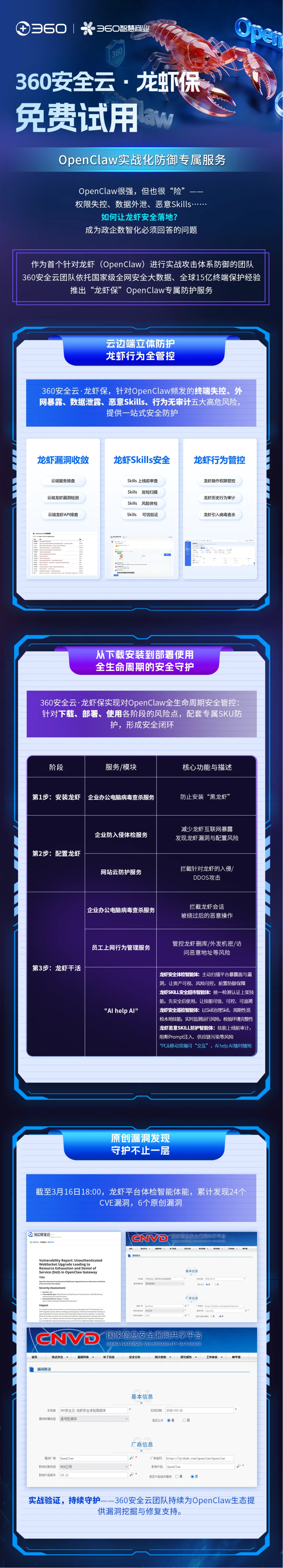 截至3月16日,龙虾平台体检智能体能,累计发现24个CVE漏洞,6个原创漏洞,结合已发布的龙虾恶意SKILL防护智能体,四大数字专家各司其职又环环相扣,真正实现"AIHELP AI",让龙虾保客户安心释放AI生产力。