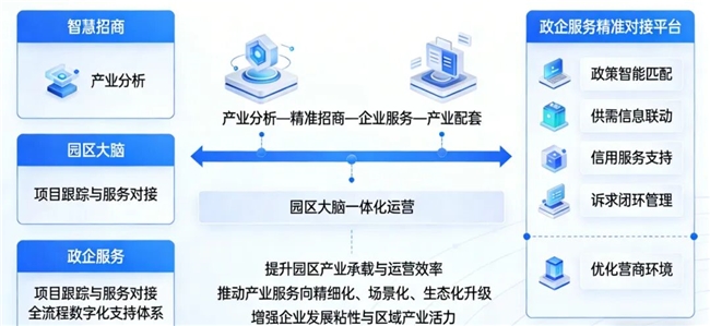 产业专题智管平台聚焦智慧招商、园区大脑、政企服务等场景,构建覆盖产业分析、项目跟踪与服务对接的全流程数字化支持体系,通过园区大脑一体化运营,打通“产业分析—精准招商—企业服务—产业配套”全链条,提升园区产业承载与运营效率;同时依托政企服务精准对接平台,实现政策智能匹配、供需信息联动、信用服务支持与诉求闭环管理,推动产业服务向精细化、场景化、生态化方向升级,持续优化营商环境,增强企业发展粘性与区域产业活力。