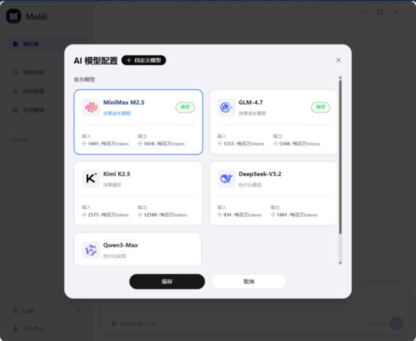 针对很多人担心的安全痛点,Molili内置了可视化安全中心,用户可以像手机设置权限一样,勾选允许或禁止AI访问某些文件夹。而针对模型配置难,当贝团队在后台完成了所有国产大模型(DeepSeek、MiniMax等)的对接,用户只需像充话费一样购买积分,就可以在界面里随意切换模型,甚至支持企业自定义接入私有模型。