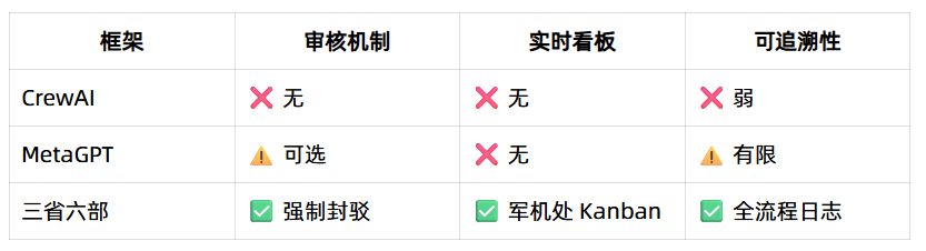 对比 CrewAI、MetaGPT 等国外框架,「三省六部」框架在核心能力上实现了全面超越: