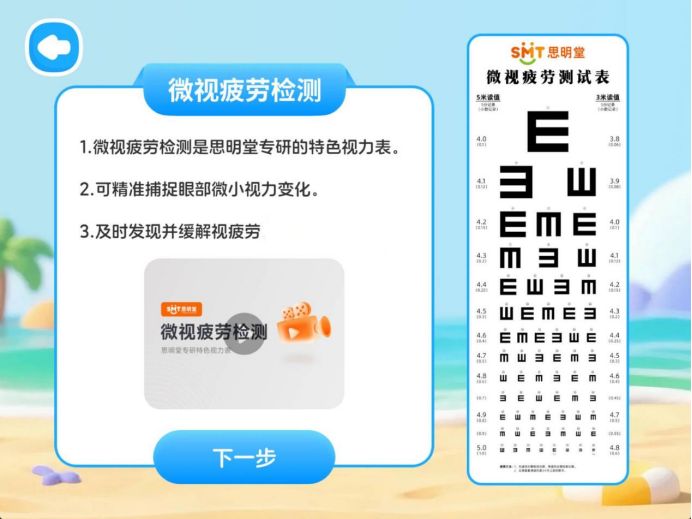 思明堂软件会每周提醒你:“本周的视力监测时间到啦!”还会自动把每次的数据连成一条线,如果发现这条线连续两次往下走,或者低于他这个年龄段的平均水平,孩子可就能处于视疲劳状态,建议进行干预。