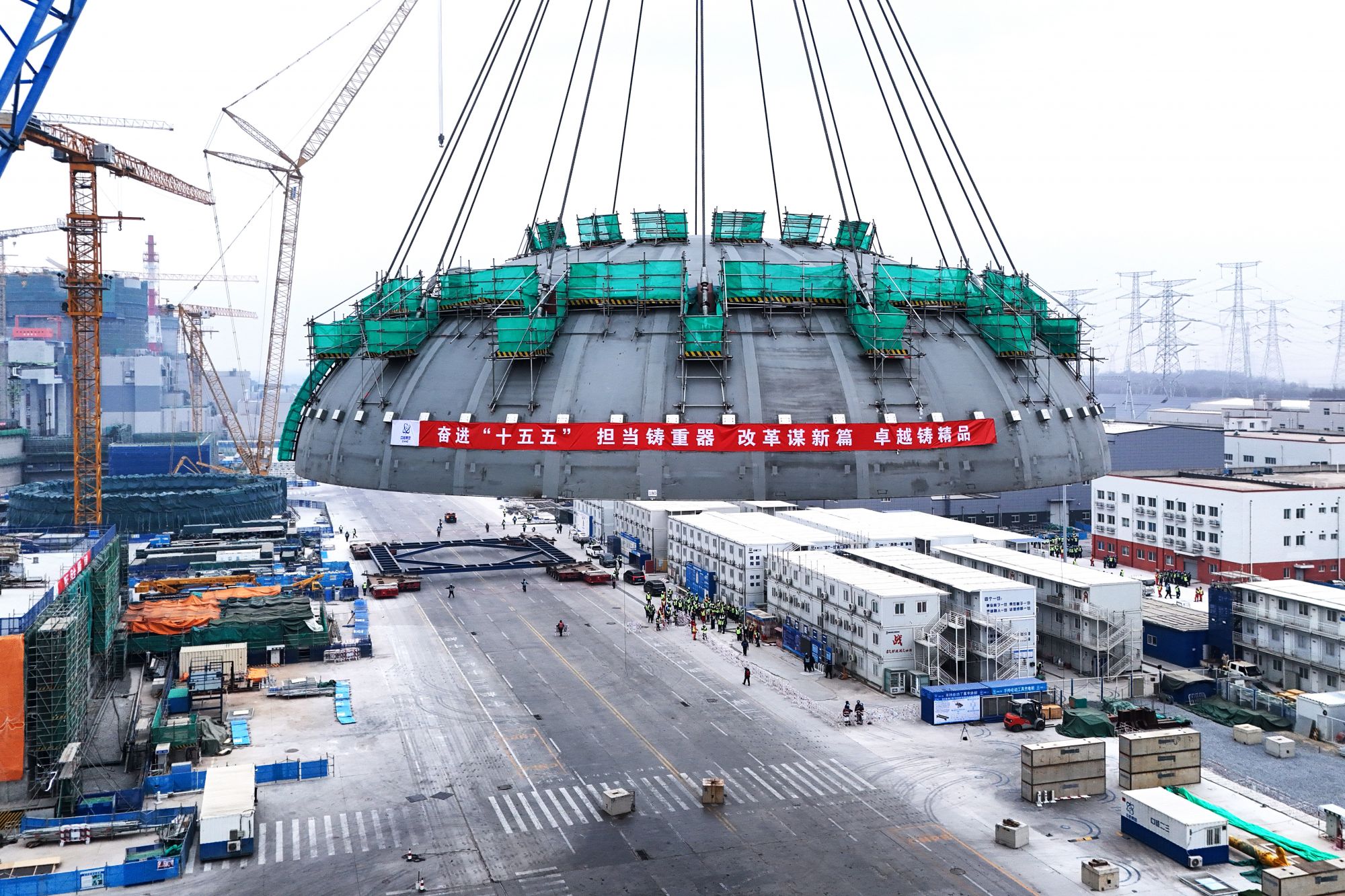 2026年2月10日在辽宁省葫芦岛市拍摄的徐大堡核电站1号机组核岛钢制安全壳顶封头吊装作业现场(无人机照片)。新华社发