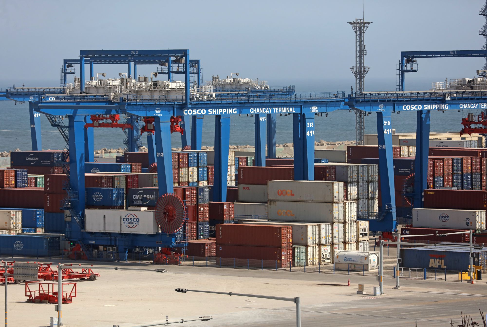 这是2025年10月7日拍摄的秘鲁钱凯港码头摆放的集装箱。位于秘鲁首都利马以北约80公里的钱凯港于2024年11月正式开港,标志着中秘共建“一带一路”取得新的重要成果。新华社发(玛丽安娜·巴索 摄)