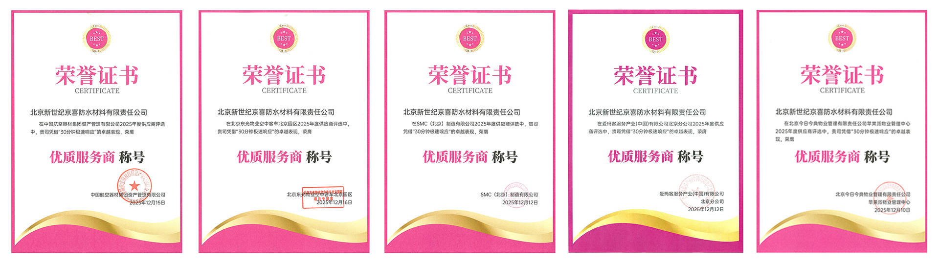 针对行业响应滞后的核心痛点,京喜防水在2026年正式官宣品牌全新定位「30分钟响应」,独创“疾风响应体系”,成为首个在防水行业制定响应体系的企业。该系统梳理、明确了33类核心工程需求,整合规范动作超1000项,全面覆盖市政工程、住宅项目、小区改造、商业体维修等多元业务场景。从需求发起开始,京喜防水承诺30分钟内给出专业反馈与初步方案,针对突发状况可快速联动资源开展处置,真正实现需求精准对接与服务高效闭环,彻底解决工程协作中的响应滞后难题。凭借这一差异化服务优势,京喜防水已先后获得中国航空器材集团、北京东光物业等多家央企、商业体及物业集团的高度认可与“优质服务商”认证。