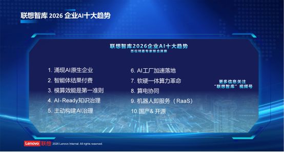 为洞察AI技术在企业中的落地前景,联想智库通过对百余位联想智库专家调研,梳理形成2026企业AI十大趋势:其中,在企业形态层面,AI原生企业批量涌现;在商业模式与治理层面,商业模式方面正从大模型Token付费到智能体结果付费演进,同时,AI-Ready成为企业知识治理新准则、AI治理从被动应对进入主动构建;在行业需求层面,企业推理需求爆发,AI工厂加速落地、RaaS(机器人即服务)成为物理AI从试点走向规模化的重要路径;在技术底座维度层面,AI算力优化从“单点提速”转向软硬一体,推动算力效率革命、算电协同降低AI总拥有成本。