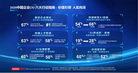 “这十个趋势背后其实都指向同一件事,即整个行业从+AI正在进入到AI+阶段。”阿木表示。立足于这一背景,联想面向全行业620家政企CIO做了深入调研并发布了《指南》,结合这一报告,阿木明确指出2026年六大企业AI行动方向: