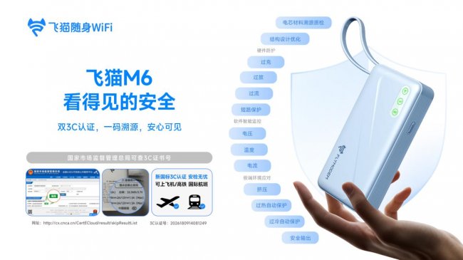 飞猫M6严格通过3C 认证,支持国家市场监督管理总局平台扫码溯源,每台设备的认证信息、生产流程均可查询,安全责任可追溯,从源头保障用户使用安全。同时搭载多重安全防护系统,覆盖过压、过流、过热、过冷、短路、挤压等极端场景,全方位守护充电与连网安全。此外,产品符合航空安全标准,可随身携带登机,满足高频差旅用户的出行需求。