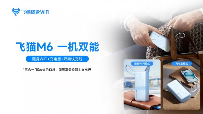 3月18日,飞猫新品M6 新国标认证充电宝随身 WiFi正式开售。产品以一体化创新设计,融合随身 WiFi、充电宝、双向快充数据线三大核心功能,为用户提供安全、高效、便捷的移动网络服务与充电解决方案,重新定义移动生产力与娱乐体验。