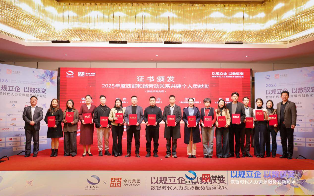 为表彰行业先进、凝聚行业力量,论坛特别设置荣誉表彰与聘书颁发环节,由成都人力资源协会劳动关系专委会牵头,颁发“2025年度西部和谐劳动关系共建个人贡献奖”及劳动争议兼职调解员聘书。中国行为法学会法律风险防控专委会理事、四川省法学会劳动与社会保障研究会理事、成都人力资源协会劳动关系专委会主任黄振哲,锦江区人力资源和社会保障局产业发展科科长苏铖浩,上海江三角律师事务所高级合伙人、四川省人社厅劳动保障监察专家团成员阎付克,成都人力资源服务行业协会劳动关系专委会副主任兼秘书长、成都人力资源研究会荣誉秘书长刘志良,共同为获奖个人颁发证书与聘书。此次表彰既是对行业先进个人在和谐劳动关系构建、劳动争议化解等方面突出贡献的肯定与致敬,也进一步凝聚了行业合力,为推动西南地区构建规范、和谐、稳定的劳动关系生态奠定了坚实基础。