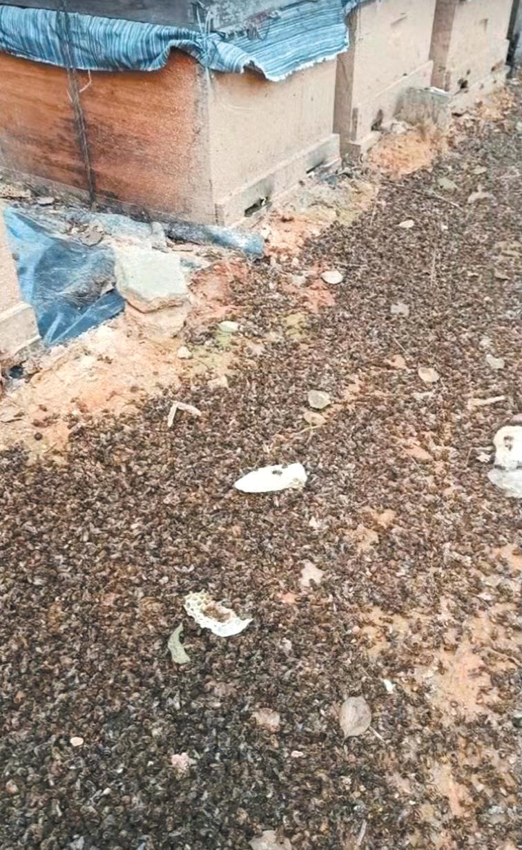 彭先生蜂箱附近的死蜂。