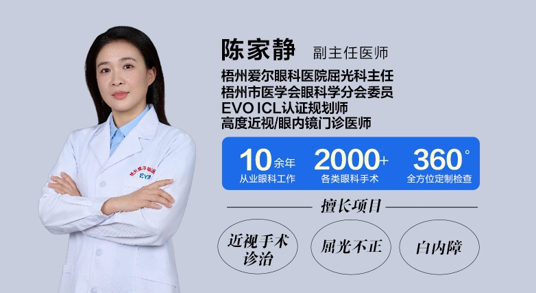 如果您有近视矫正的需求,可前往梧州爱尔眼科医院屈光科,咨询陈家静主任,解锁专属个性化摘镜方案,在严谨专业的诊疗服务中,安心摆脱眼镜束缚。