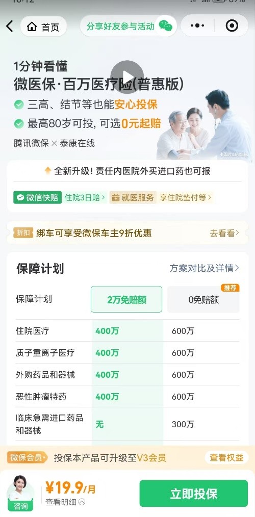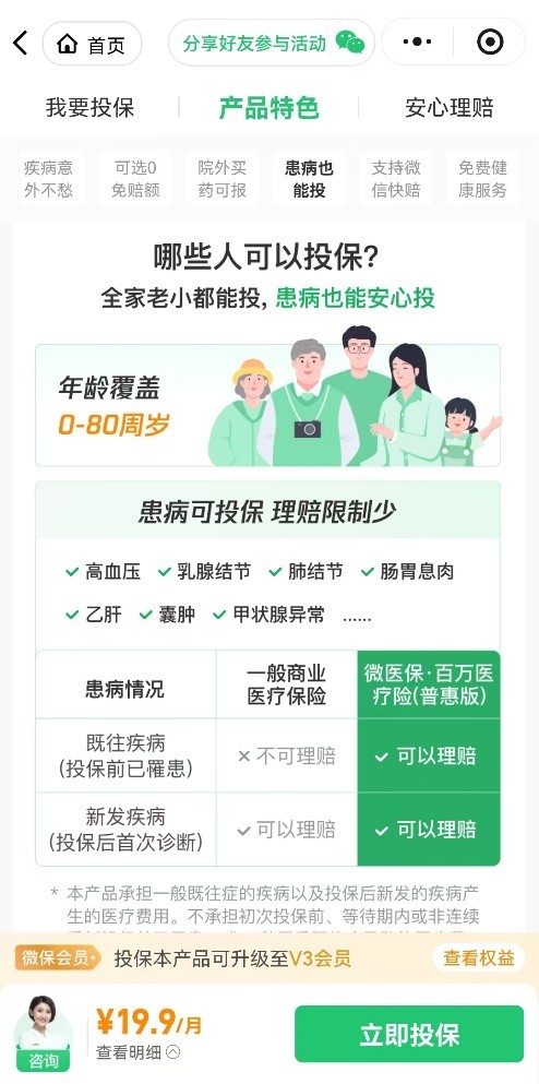 但当前很多保险对健康告知要求严格,有既往病史的人群往往面临投保无门、被拒保或责任除外的困境,“想保而不能保”成为普遍痛点。在此背景下,腾讯微保依托自身平台优势,携手保险公司推出可带病投保的医疗险——微医保・百万医疗险(普惠版)。