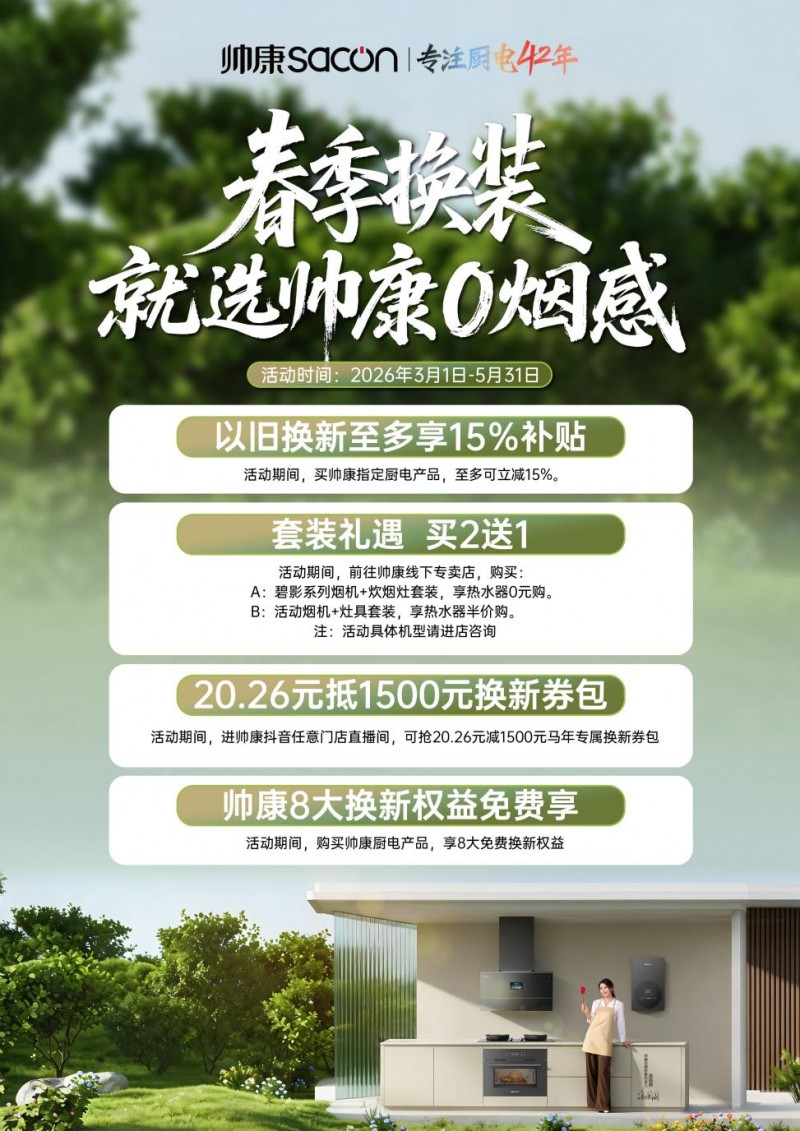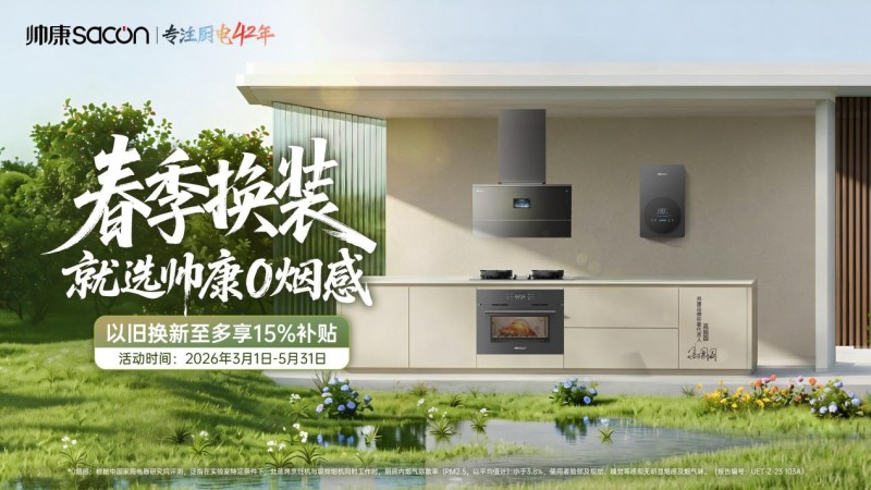 2026年春季伊始,新一轮家电国补政策在全国多地陆续恢复申领,持续释放惠民红利。此次帅康以旧换新与国家政策同频,精准切入春季装修改造需求,帅康厨房焕新方案以切实的让利行动和帅康厨房健康解决方案,践行“技术为人,创造健康美好生活”的企业使命,为万千家庭构筑更安心、更舒适、更高品质的健康厨房生活。