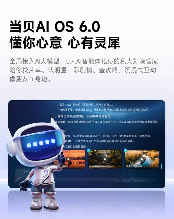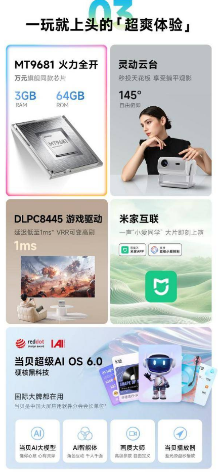 智能交互上,该机搭载斩获双项大奖的当贝超级AI OS 6.0系统,无广告、开机直达主页,AI语音控制便捷高效。全自动梯形校正、智能避障功能降低操作门槛,双5W杜比音效与28dB超低噪音,营造舒适观影环境。