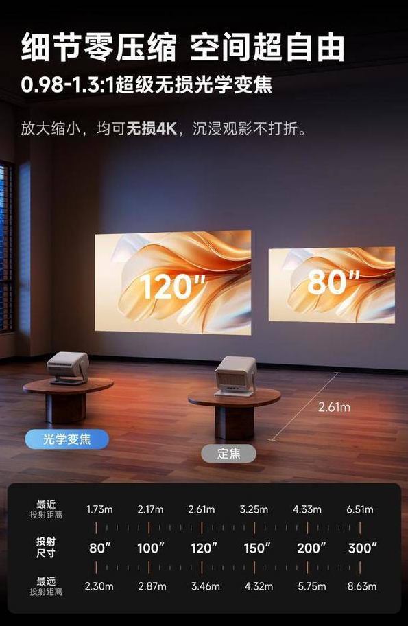 场景适配方面,该机针对卧室及小户型优化,0.98-1.3:1超级无损光学变焦可通过遥控器调节画面大小,2.6米即可投射120寸巨幕,画质无损耗。145°超大云台俯仰设计,可灵活实现投墙、投天花板等多元场景,打破空间限制。
