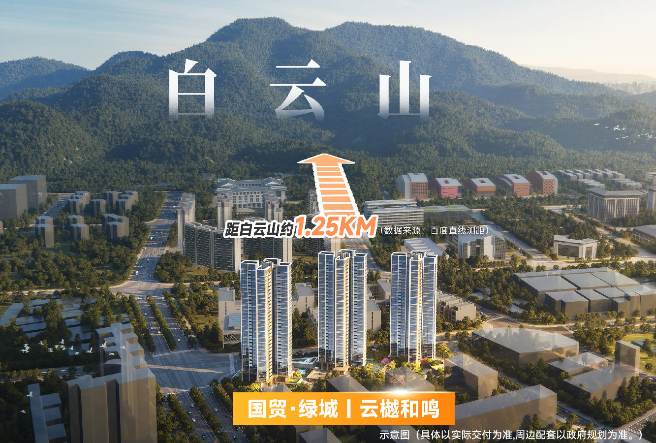 天赋贵壤,立序城芯尽享繁华。云樾和鸣位于白云新城的十字中轴C位——东西向串联完整文脉带,南北向聚合产业与交通经济动脉,东南向直面白云山,拥有约348米云山景观界面,高层单位可同时俯瞰千年云山与繁华城景。