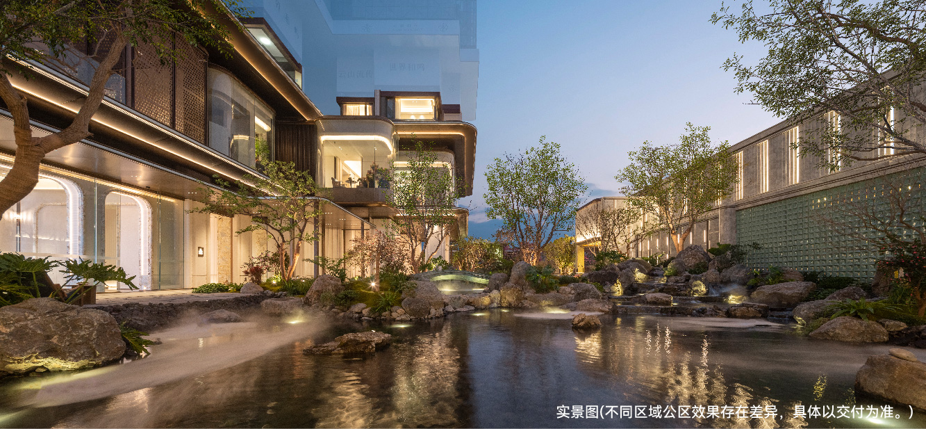 云樾和鸣以白云山“林、泉、溪、石”灵感,打造“一轴四幕九境”园林画卷。从源自传统文化“宝匣启玉”灵感的双层奢石云门,到汝窑天青色照壁,再到流水潺潺的廊下花园、静卧碧波的奢石拱桥……每一次归家都漫步在如诗如画的山水庭园。
