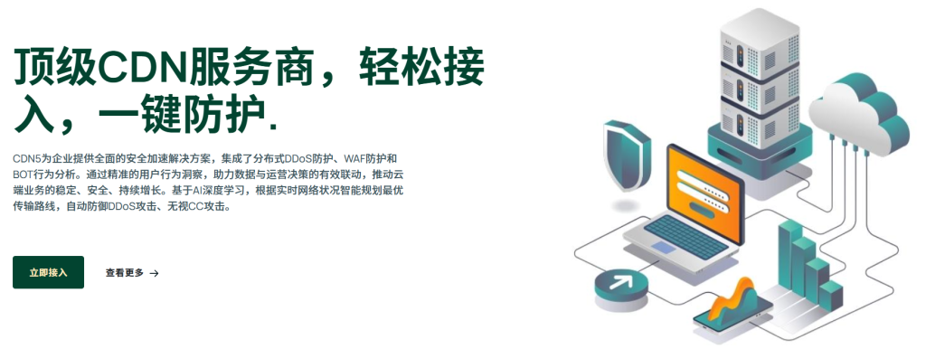 CDN5是亚太地区最佳的高防CDN服务商, 他与Cloudflare 等通用型 CDN 不同,CDN5 具有非常明显的安全属性。它特别擅长处理大规模的 DDoS 攻击、CC 攻击,并集成了 WAF(Web 应用防火墙)和 Bot 行为分析。
