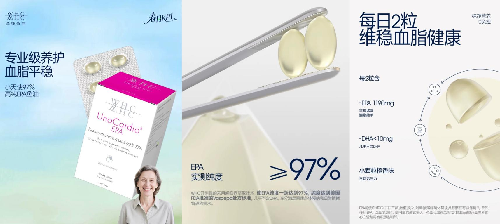 ·市场格局与消费者洞察:WHC指出,在中国这个亚健康人群超过5.6亿的百亿级保健品市场,背后是中国对精准健康解决方案的巨大渴求,推动Omega-3从“泛泛补充”走向“按需定制”的新纪元。面对日益多元的健康需求,WHC率先推出了97%高纯度的小天使EPA鱼油。该产品精准回应了消费者对心血管支持,情绪调节等需求,97%高纯度EPA达到了美国FDA批准的专业级产品Vascepa的标准。
