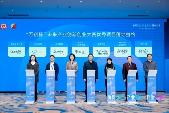 优质平台落地,优质项目也接踵而至。作为本次会议的核心亮点之一,2025“万创杯”未来产业创新创业大赛优质项目落地签约仪式在会上同步举行,至真明光、清博航动、沃民未病先觉智能、天问穹知、阿隆科技、北京心识科技、未名脑脑、元能星泰及国科先行9个项目正式签约落地万寿路紫荆花科技孵化园区,为推动地区产业生态建设注入鲜活创新力量。