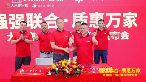 3月19日,以“强强联合·质惠万家”为主题的大角鹿岩板与三协建材战略签约发布会在佛山成功举行。