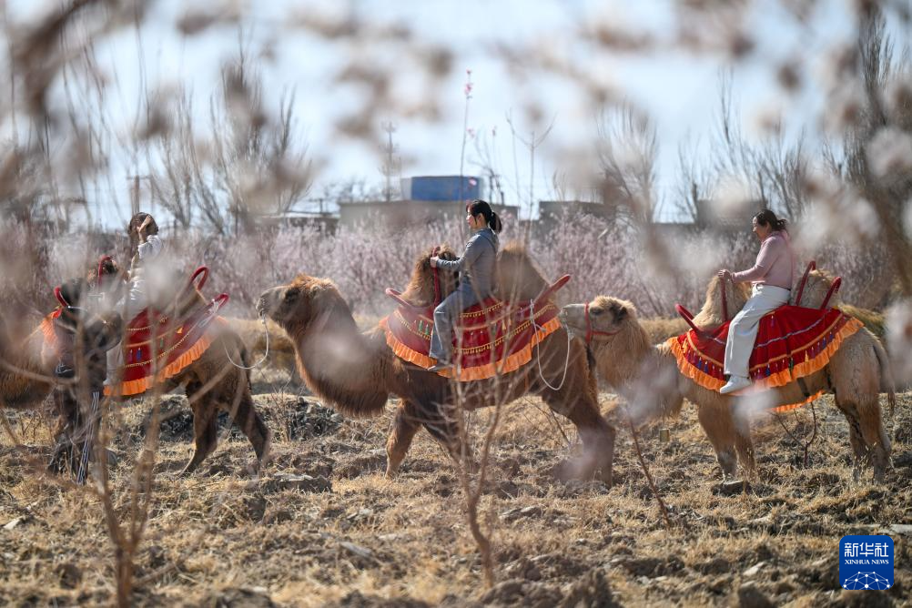 3月20日,在新疆吐鲁番市托克逊县南湖杏花村,游客骑骆驼赏杏花。