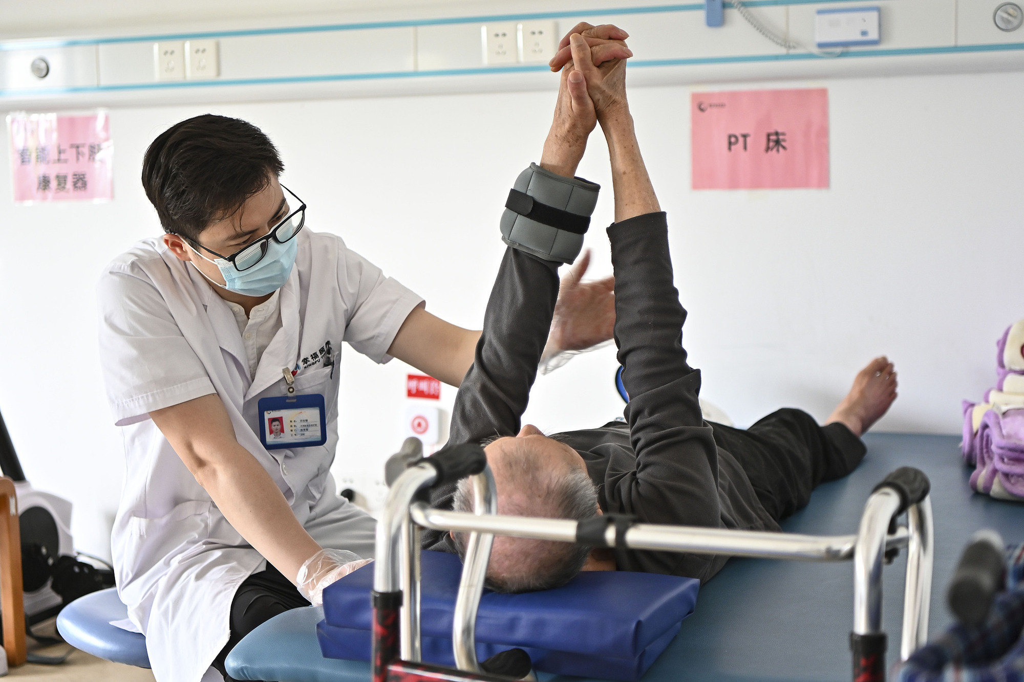 广州,南沙区养老院,工作人员协助老人进行理疗康复。