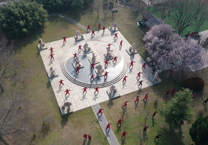 2026年3月18日,来自俄罗斯雅库茨克的陈一梅(前)在陈家沟练习太极拳(无人机照片)。新华社记者 李嘉南 摄