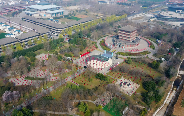 2026年3月21日,在河南省温县中国太极拳博物馆前,太极拳爱好者进行太极拳展演,庆祝首个“国际太极拳日”(无人机照片)。新华社记者 郝源 摄