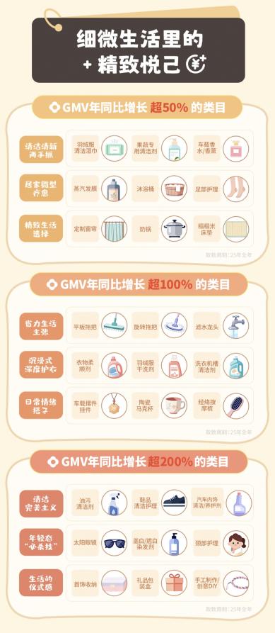 2025年,GMV年同比增长超100%的行业类目包括平板拖把、衣物柔顺剂、洗衣机槽清洁剂、车载摆件、陶瓷马克杯、经络按摩梳等,追求省时省力、精致悦己、情绪消费的偏好也有所体现。