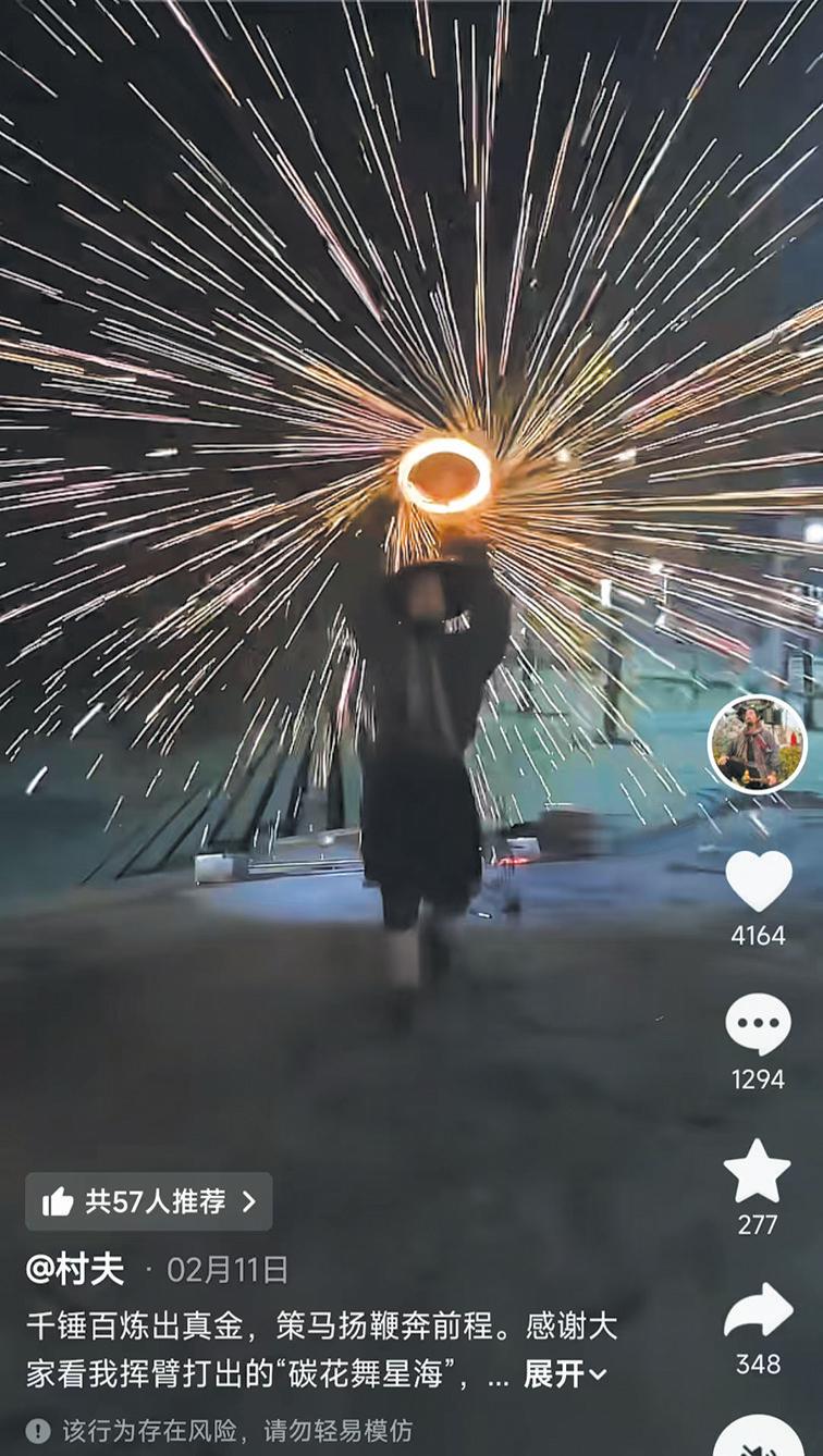 有网友录屏了村夫的直播,一段3分钟的炭火舞下来,他累得气喘吁吁。以往,在深夜打铁花累了,他还会跳上一曲调节气氛,但无论什么时候,视频中的村夫永远是笑着的。